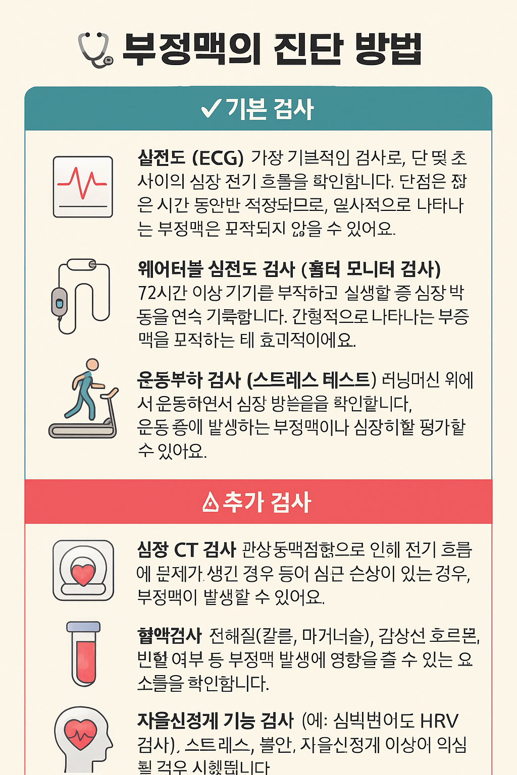 이러한 증상들이 반복적으로 나타난다면 부정맥이 의심되며, 정확한 진단을 위해 반드시 병원을 방문해야 합니다.