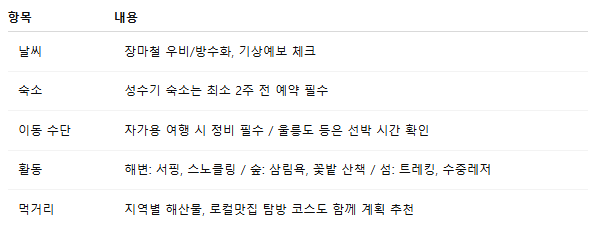 - 여행 팁: 날씨 때문에 배편이 자주 끊겨요. 최소 2박 이상 일정 권장!